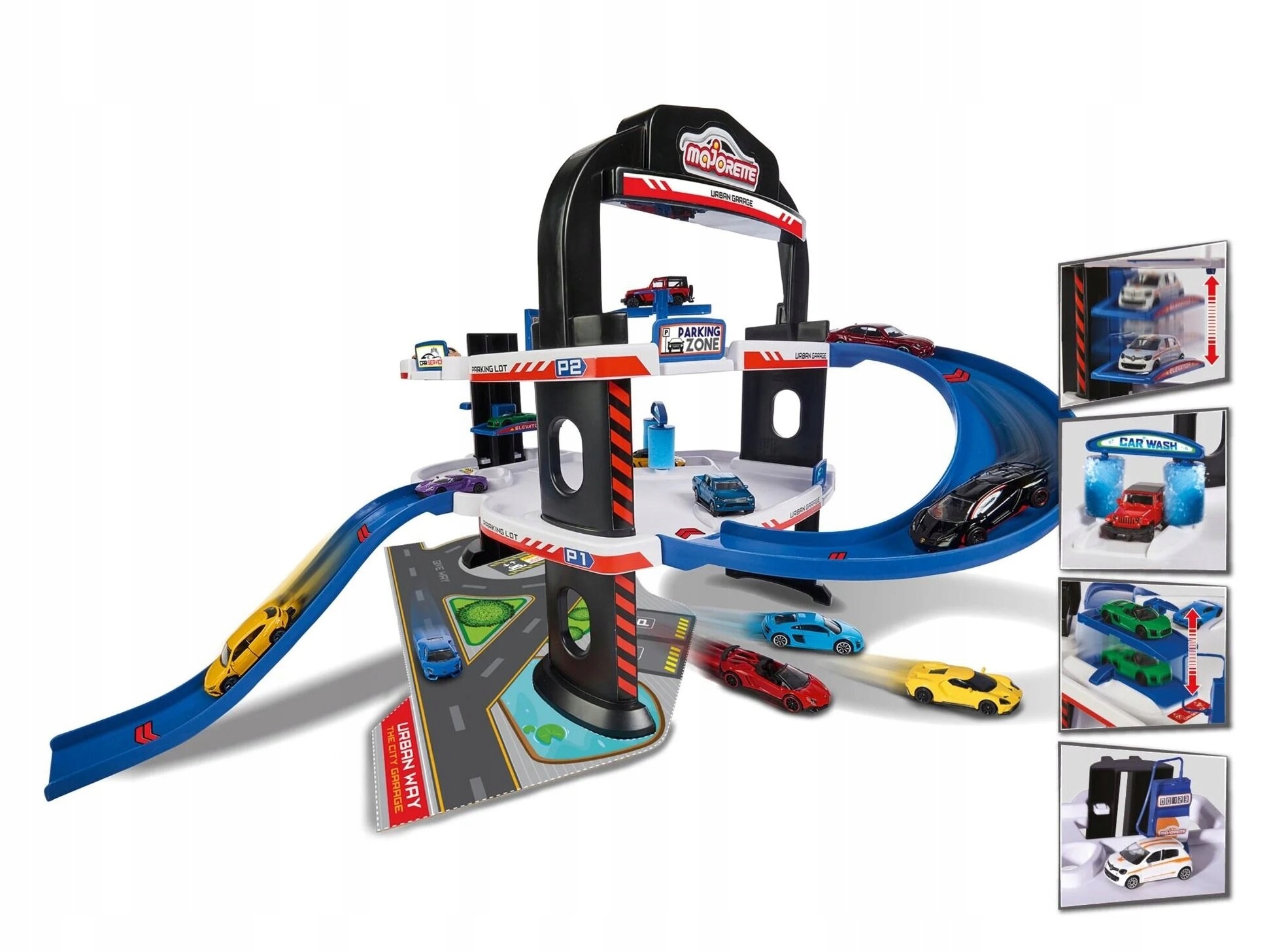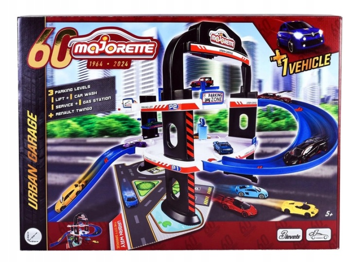 Duży 3 poziomowy garaż w specjalnej limitowanej edycji na 60-lecie marki Majorette. Są tu stacja benzynowa, warsztat, winda oraz myjnia samochodowa. Parking miejski Majorette to idealny zestaw do zabawy dla małych fanów motoryzacji, jest tu wiele do odkrycia i nieograniczona zabawa dla małych samochodzików i ich kierowców. 3-poziomowy garaż dodatkowo zaopatrzony jest w pasy ruchu, rampy wyjazdowe, zjeżdżalnię, naklejki. Dołączony oficjalnie licencjonowany pojazd – aby można było bezpośrednio korzystać z dużego garażu samochodowego z krętymi torami jazdy zawiera metalowy resorak Renault Twingo w skali 1:64 o długości 7,5 cm z zawieszeniem. Szybkie zjazdy robią wrażenie i zachwycają fanów motoryzacji, solidny salon samochodowy to trafiony prezent dla chłopców i dziewczynek w wieku od 5 lat.