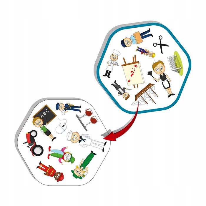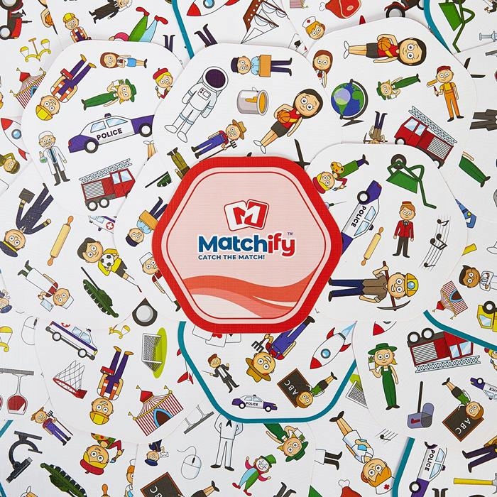 Gra Matchify Professions zawiera dwie talie kart, na każdej znajduje się 9 symboli. Każda karta z pierwszej talii zawiera jeden symbol, który można dopasować do innego symbolu z dowolnej karty w drugiej talii. Na przykład traktor można dopasować do rolnika, a mikroskop do chemika.